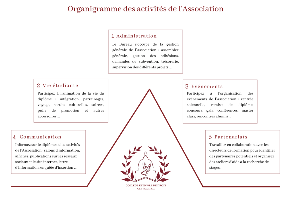 - Promouvoir le Collège et l’École de Droit, tant au sein de l’Université Paris-Panthéon-Assas, qu’auprès des autres établissements d’enseignement supérieur, des établissements d’enseignement secondaires et du monde professionnel ;