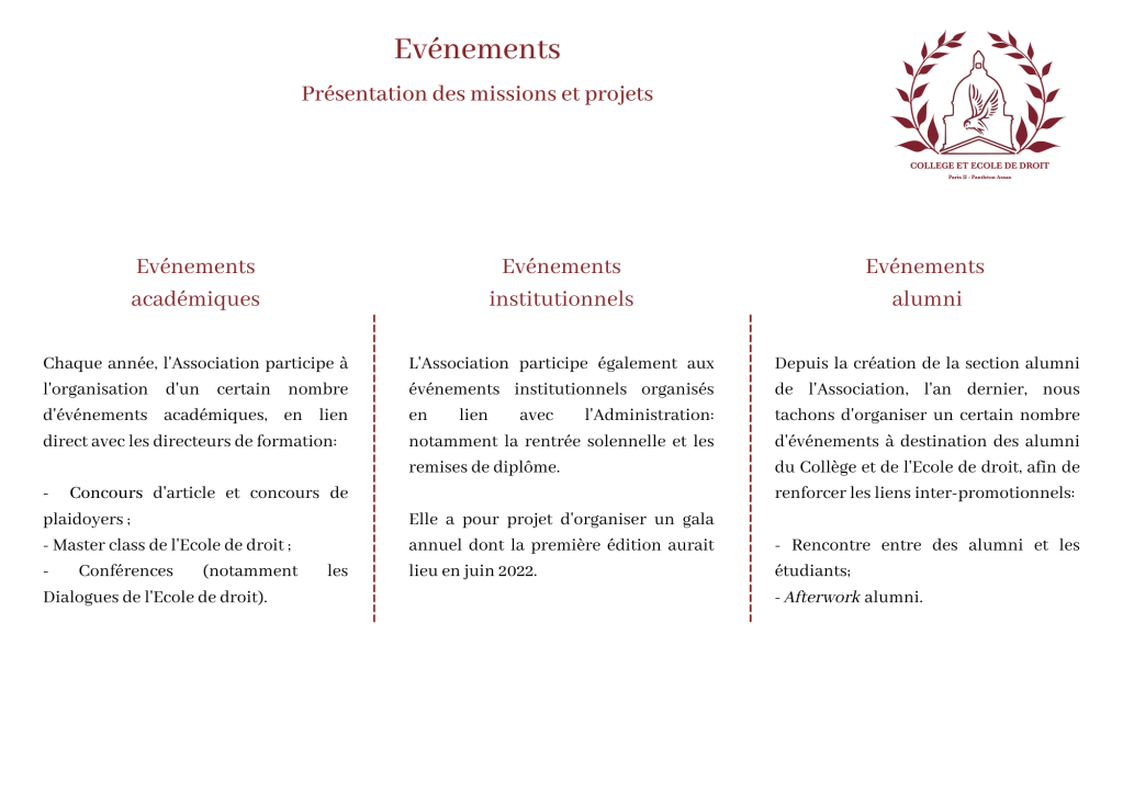 L’Association a pour objet de faciliter l’interaction des étudiants et anciens étudiants du Collège et de l’École de droit entre eux et avec les acteurs du monde juridique.